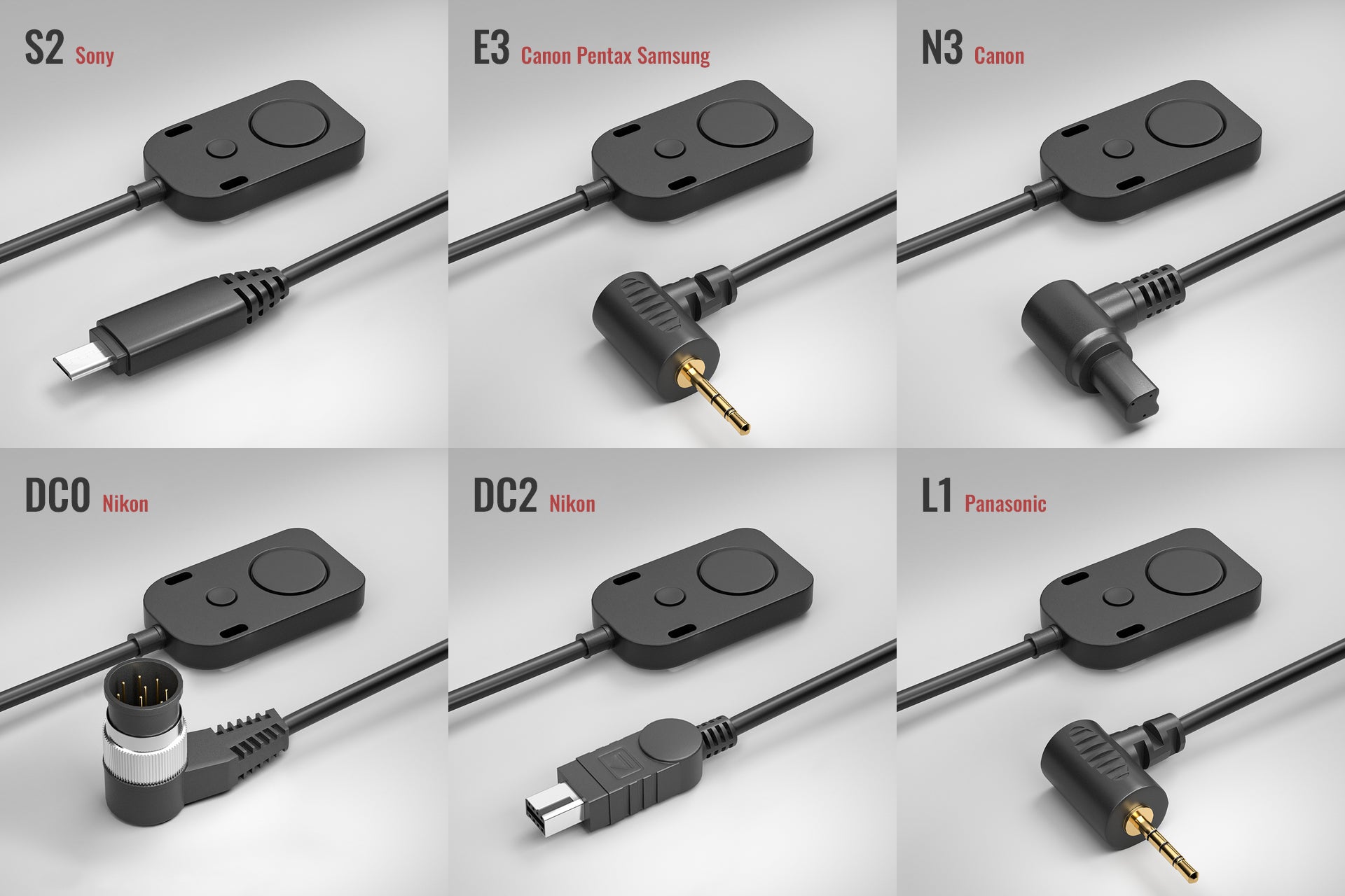 The grip set is compatible with a variety of triggers, including S2 for Sony, E3 2.5mm for Canon, Pentax, and Samsung, N3 for Canon, DC0 for Nikon, DC2 for Nikon, and L1 for Panasonic. Below you can find a comprehensive list of compatibility, ensuring your trigger of choice works seamlessly with the system.