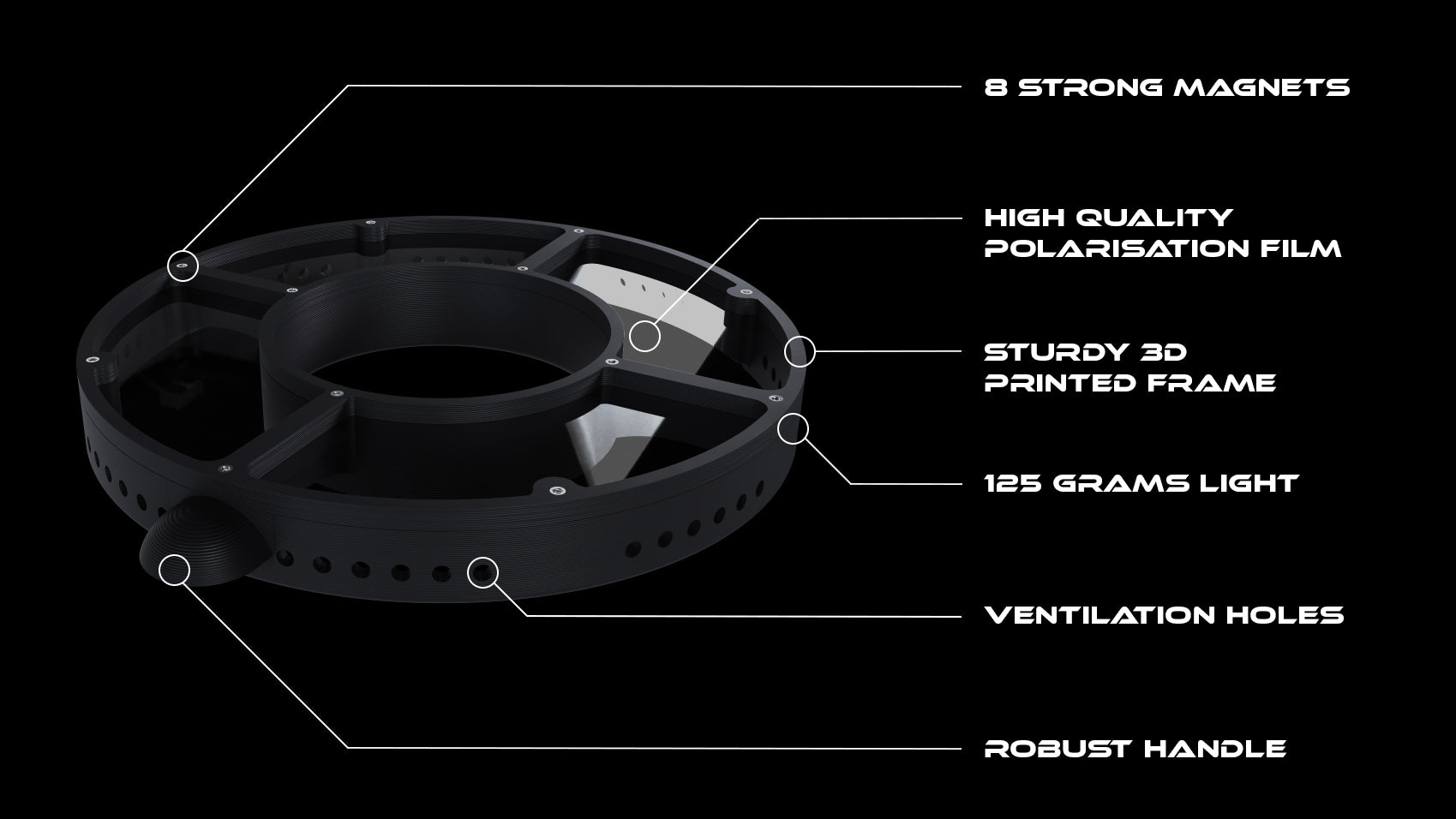 This filter is easily attached to your ring flash using magnets, making setup fast and secure in any situation. Thanks to the magnetic system and its ergonomic handle, the filter can be adjusted in 45-degree increments, allowing you to quickly switch between cross-polarized and parallel-polarized lighting setups in seconds.